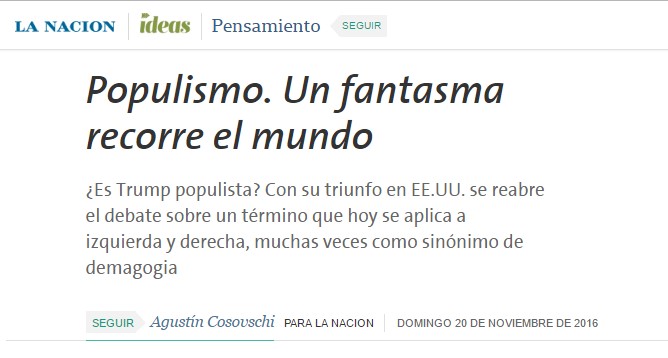 Una pista de la campaña que vendrá la puede estar brindando el diario La Nación, que durante este año publicó varios artículos atacando al populismo: todo gobierno que redunde en medidas que benefician a las clases populares es presentado como cortoplacista, desmedido, autoritario, patotero, antisistema, y finalmente peligroso ("La amenaza populista").